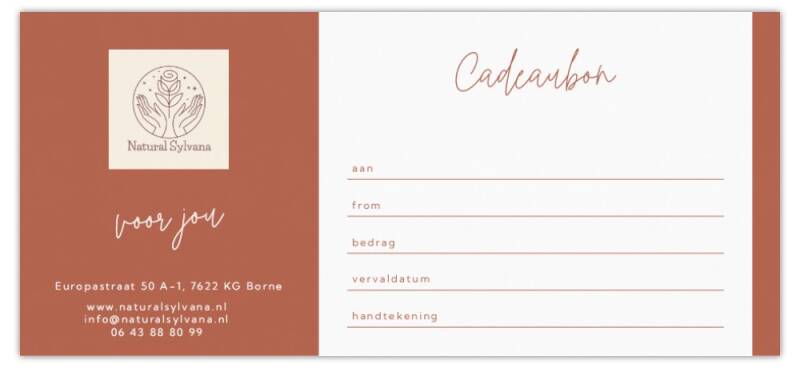 Met een cadeaubon van Natural Sylvana geef je een moment van diepe ontspanning, balans en hernieuwde energie. Het is het ideale geschenk voor iedereen die rust en nieuwe vitaliteit kan gebruiken.